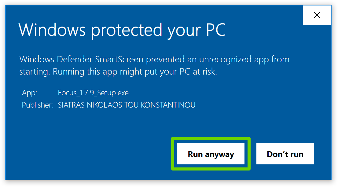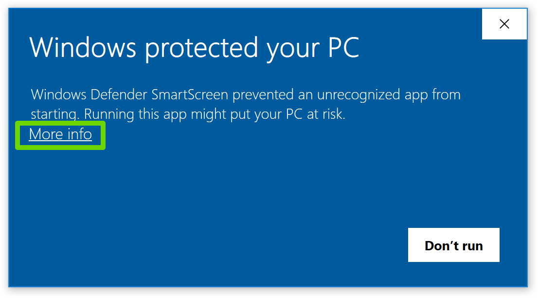 In case the Windows Defender Smart Screen appears after running the downloaded file, please select the options below.